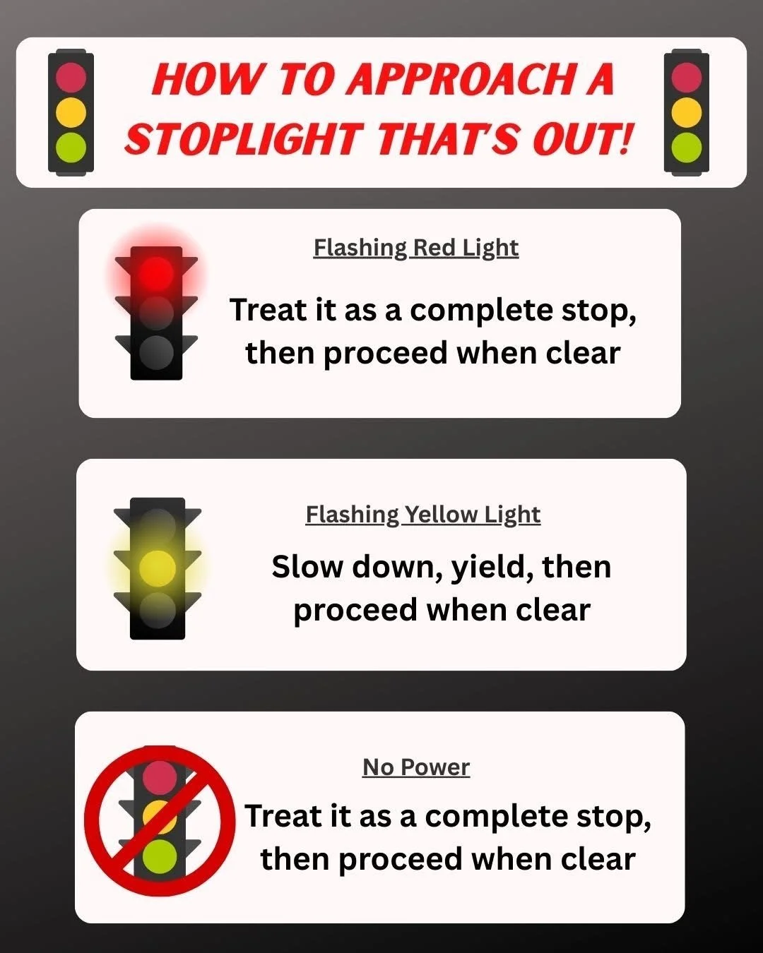 Why this matters: Most intersection accidents during outages happen because drivers treat the situation as “no rules apply.” In reality, the rules still exist—they change. Flashing red equals stop. Flashing yellow equals proceed with caution. Dark lights equal a four-way stop. Simple rules, big safety payoff.