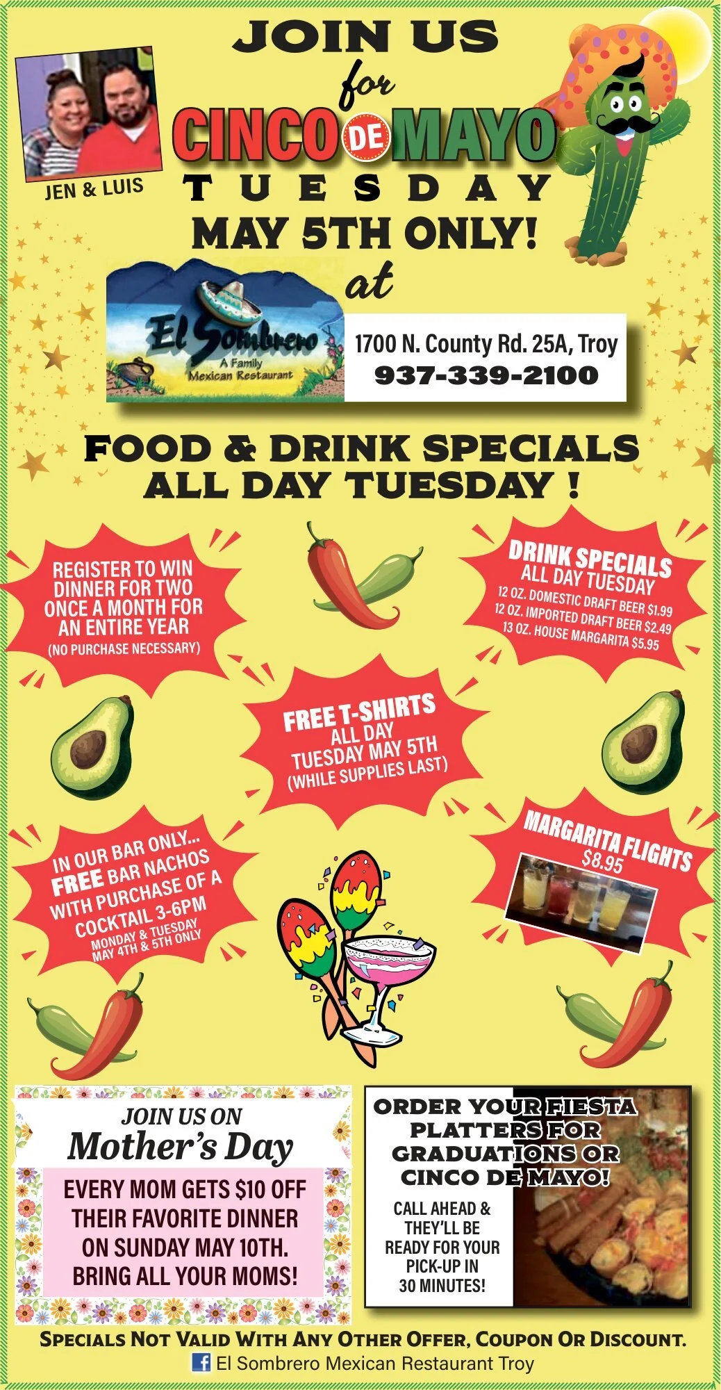 Also join them for Mother’s Day, and order your fiesta platter for graduation! Specials not valid with any other offer, coupon or discount. Visit their Facebook page (El Sombrero Mexican Restaurant Troy) or call 937-339-2100 for more information.